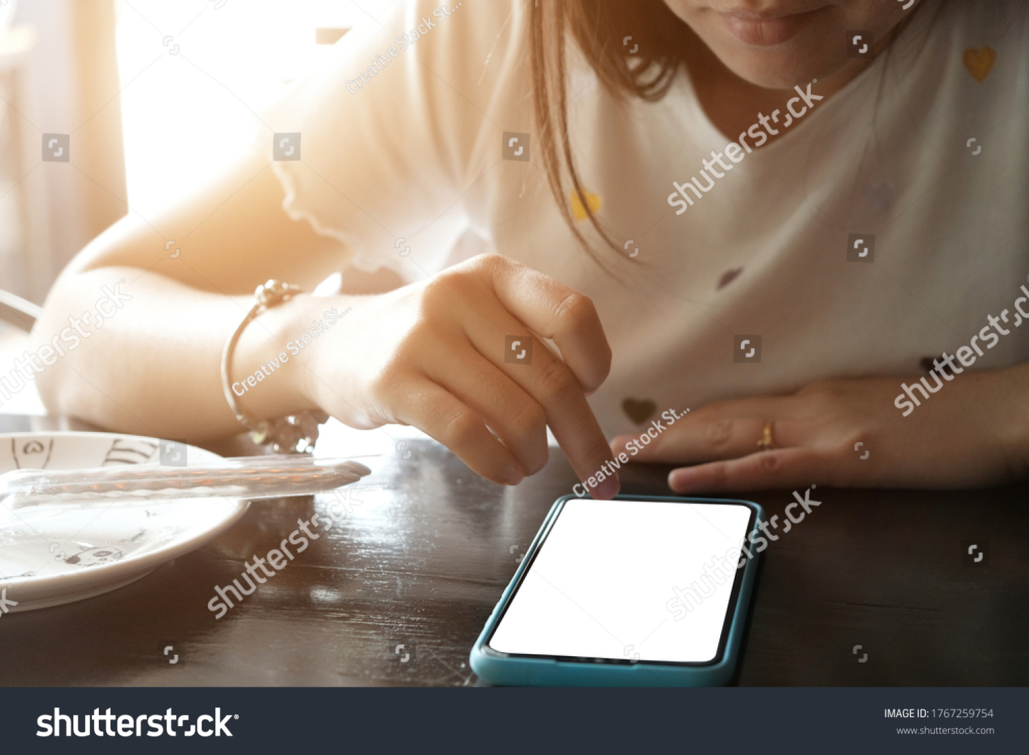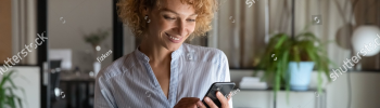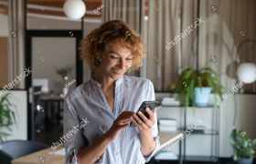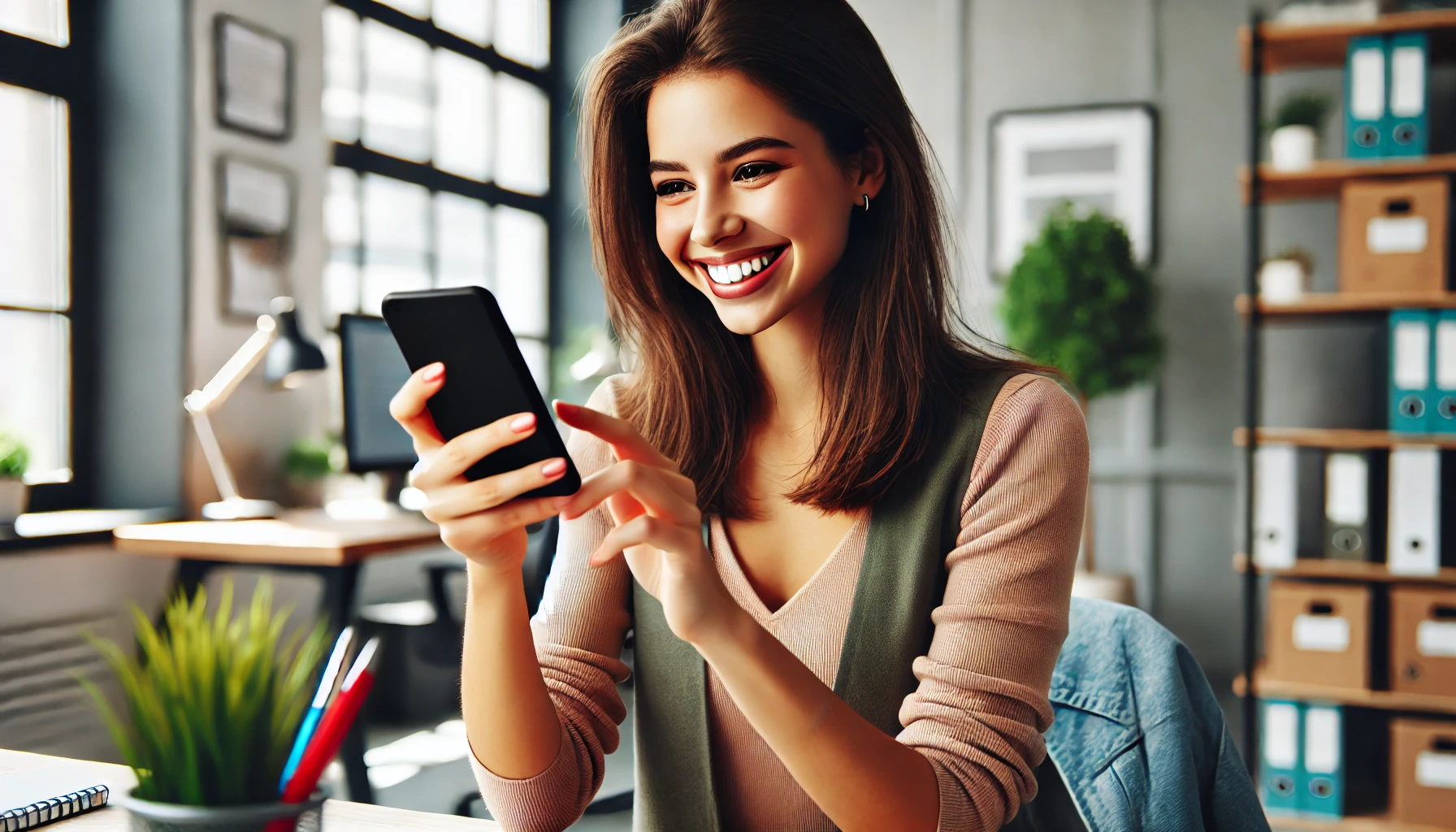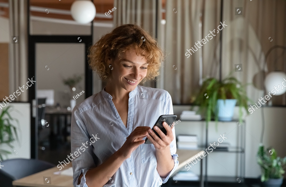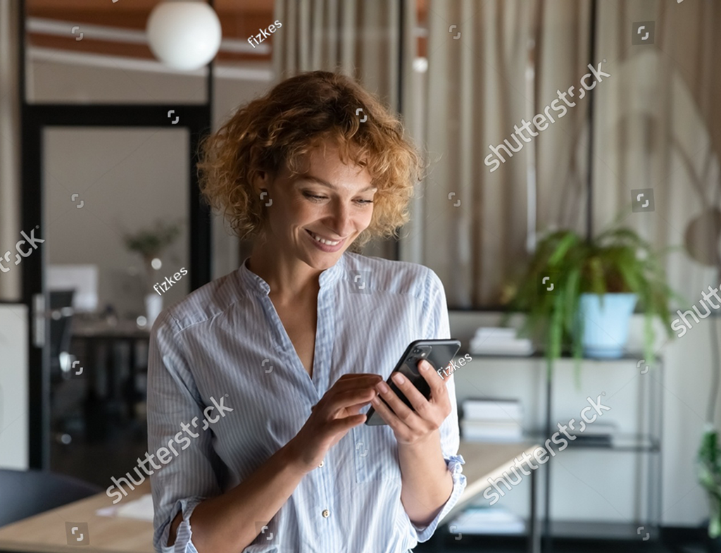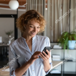 stock-photo-happy-young-self-employed-woman-using-cellphone-alone-in-office-r...